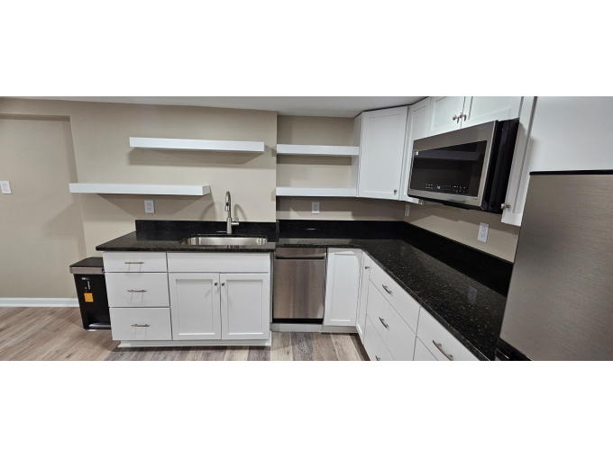 Bedroom is furnished, with a queen-size bed, dresser, desk and chair; Kitchen consists of a dinette w/chairs, refrigerator, dishwasher, microwave oven, toaster oven, and plenty of cabinet storage.